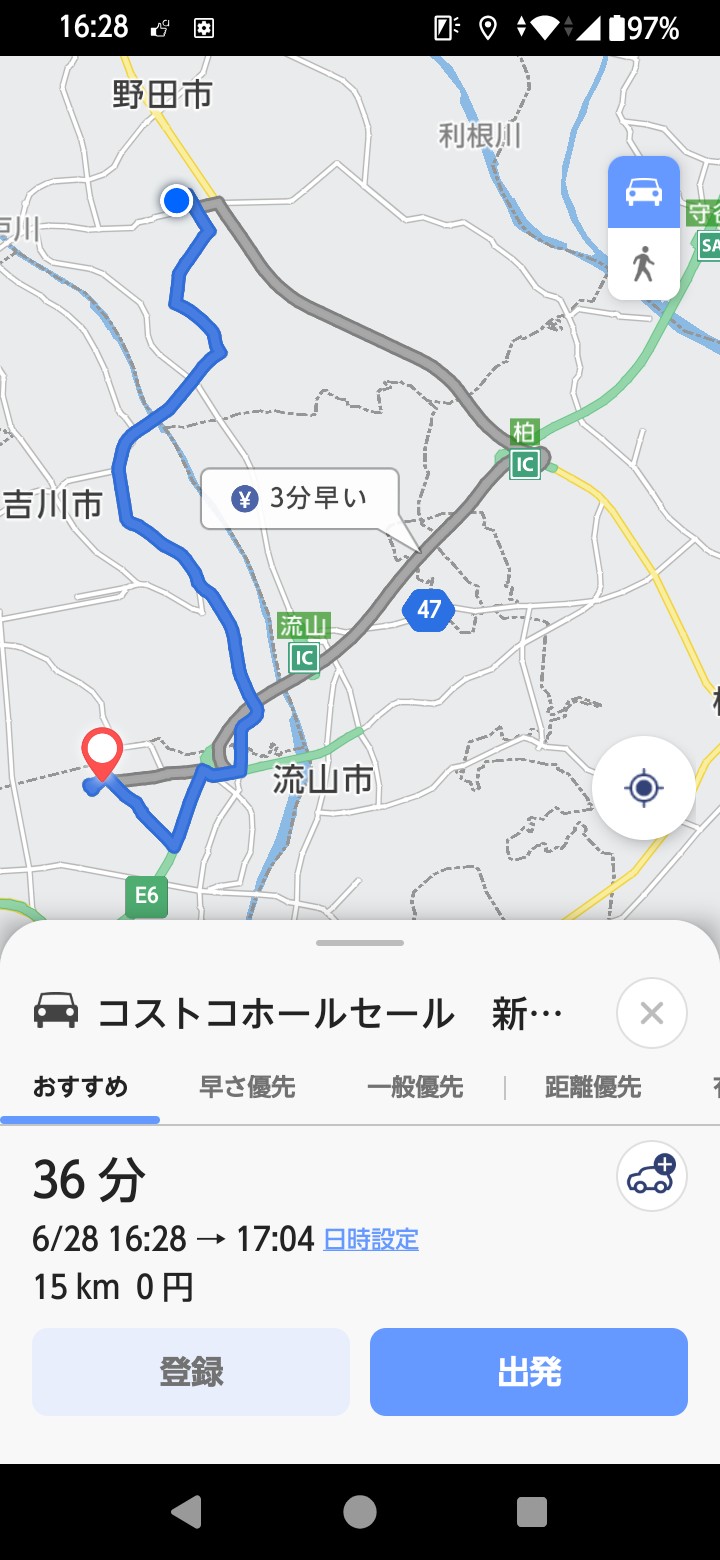 候補は、おすすめ、早さ優先、一般優先(一般道)距離優先など、様々選べます。