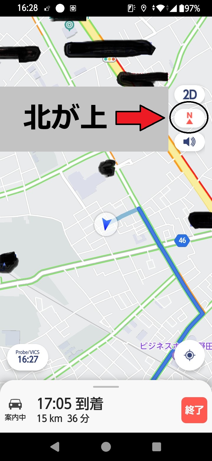 ※注意点:初期値だと北が上なので、進行方向が分かりづらかったら、ここをタップして切り替えてください。