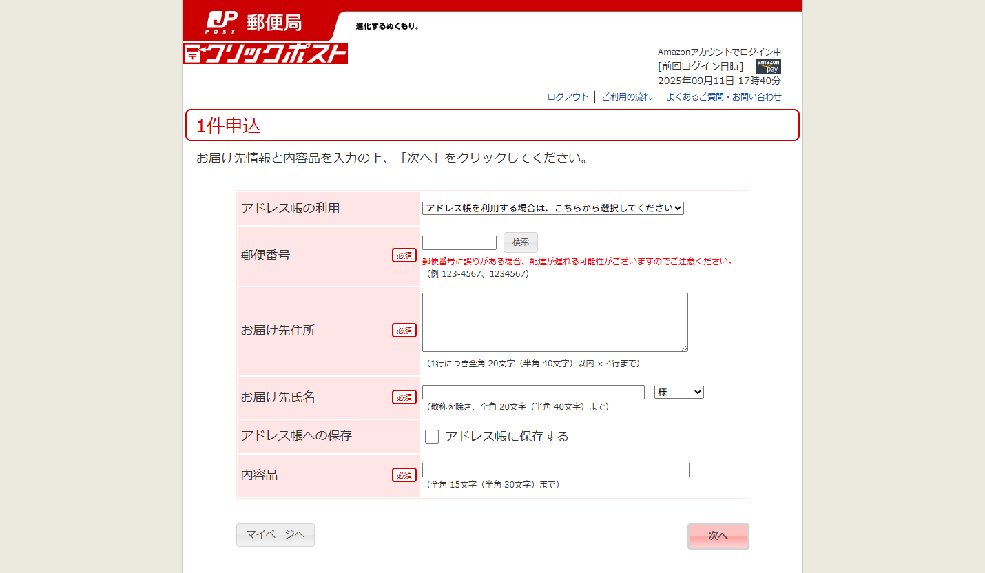 お届け先と内容品を入力して、Yahoo!ウォレットかAmazon Payで支払いをすると送り状が印刷できます。