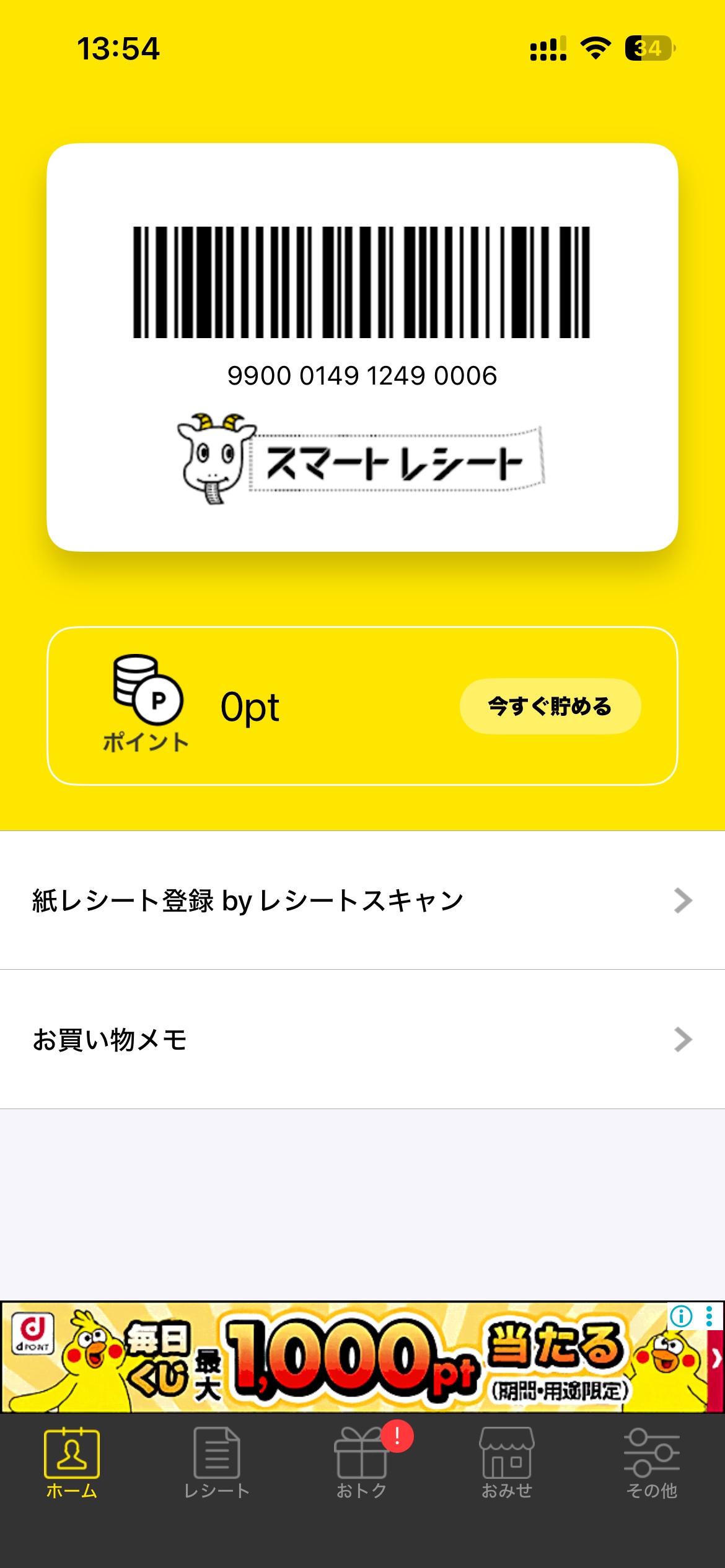 1.アプリを立ち上げると、バーコードが出るので対応しているお店のレジで読み込んでもらいます。